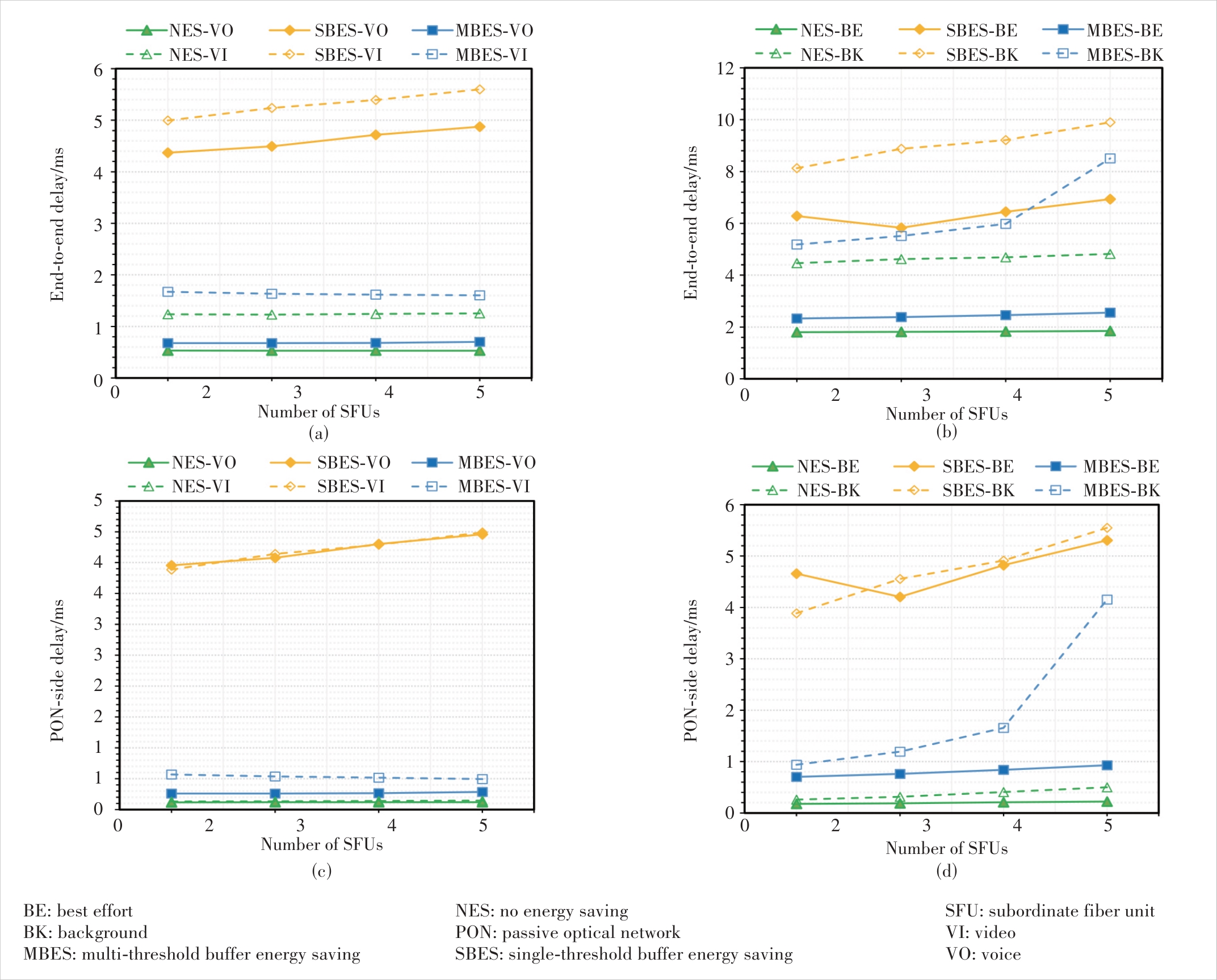 Figure 8 System latency under the NES, SBES, and MBES schemes (SFU=2): (a) end-to-end latency of high-priority services, (b) end-to-end latency of low-priority services, (c) optical-side latency of high-priority services, and (d) optical-side latency of low-priority services