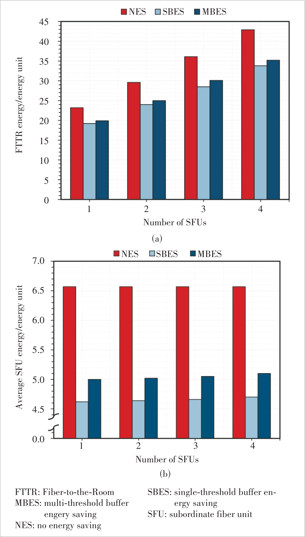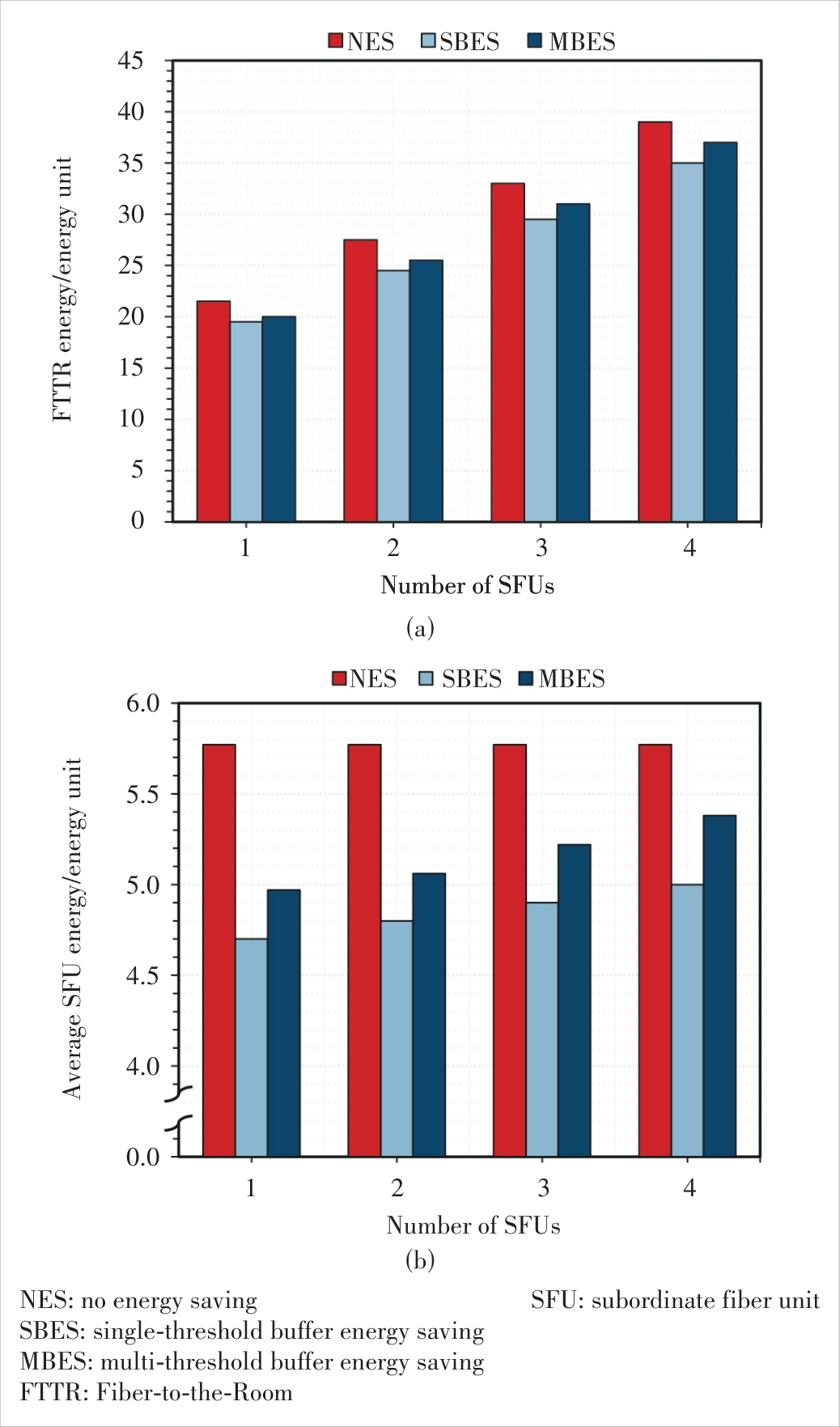 Figure 9 System energy consumption under the NES, SBES, and MBES schemes (SFU=2): (a) FTTR system energy consumption and(b) average SFU energy consumption