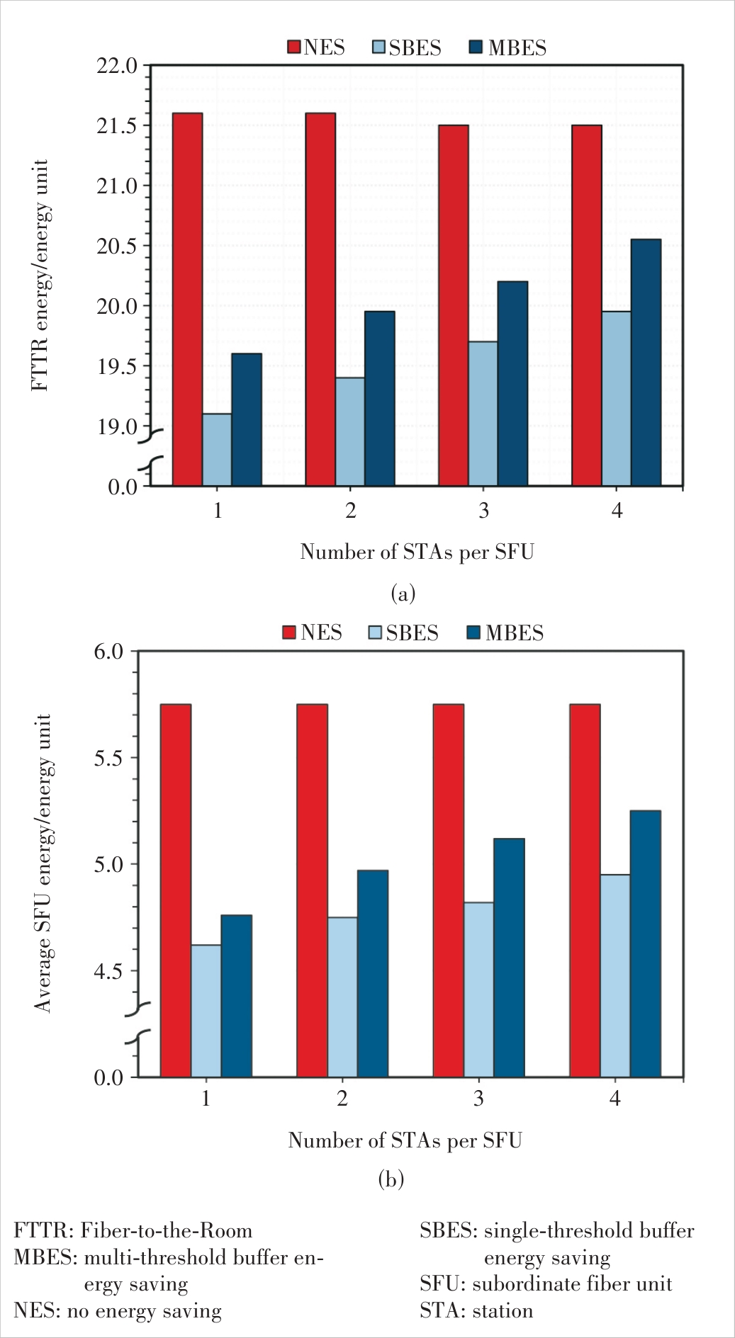 Figure 6 System energy consumption under the NES, SBES, and MBES schemes (STA=2): (a) FTTR system energy consumption and(b) average SFU energy consumption