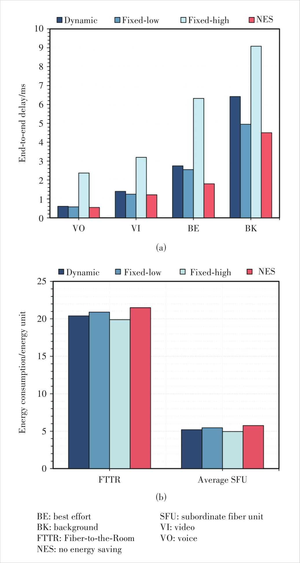 Figure 10 System latency and energy consumption under dynamic and fixed buffer thresholds: (a) latency comparison and(b) energy consumption comparison