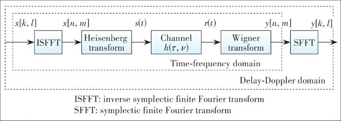 ... The modulation and demodulation for OTFS are illustrated in Fig. 1, which are implemented with the 2D inverse SFFT (ISFFT) and SFFT at the transmitter and receiver, respectively[1, 24]. Before the OTFS modulation, a (coded) bit sequence is mapped to symbols , in the DD domain, where , is the cardinality of A, and denote the indices of the delay and Doppler shifts, respectively, and and are the number of grids of the DD plane. At the transmitter side, ISFFT is performed to convert the DD domain symbols to signals in the time-frequency (TF) domain. ...