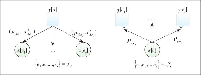 Thanks to the sparsity of , the joint distribution of the random variables in model (9) can be represented with a sparsely-connected factor graph with variable nodes corresponding to and observation nodes corresponding to . As shown in Fig. 2, each observation node is connected to a set of variable nodes , and similarly, each variable node is connected to a set of observation nodes , where and respectively denote the sets of indexes of non-zero elements in the d-th row and c-th columns of , and . The probability mass function (PMF) represents the messages from variable nodes to factor nodes .