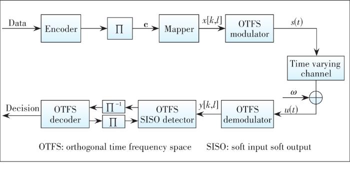 ... A typical turbo system is shown in Fig. 4, where and represent interleaver and de-interleaver, respectively. The information bits are encoded and interleaved before symbol mapping, where each symbol in the DD domain is mapped from a sub-sequence of the coded bit sequence, which is denoted by . Each corresponds to a length- binary sequence, which is denoted by . Based on the LLRs provided by the SISO decoder and the output of the OTFS demodulator as shown in Fig. 4, the task of the SISO OTFS detector is to compute the extrinsic LLR for each coded bit, i.e.,,