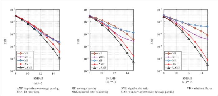 ... Fig. 5 shows the BER performance of various detectors in the case of the bi-orthogonal waveform with different numbers of paths, where we assume no fractional Doppler shifts, i.e., . We also assume , and QPSK is used. From this figure, we can see that, the MP detector performs well when , but with the increase of , its performance becomes worse. The VB detector has a similar trend. The MRC detector performs similarly to the MP and VB detectors when P=6 and delivers better performance than the MP and VB detectors with larger P. The AMP and UAMP detectors perform well, where we can see that they enjoy the diversity gain and achieve better performance with the increase of . In all cases, the UAMP based detector delivers the best performance and significantly outperforms other detectors.