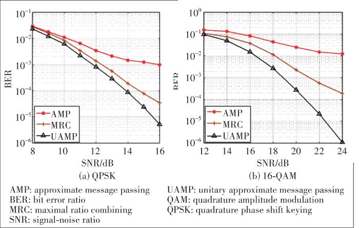 ... With the rectangular waveform and factional Doppler shifts, we compare the bit error ratio (BER) performance of the AMP, UAMP and MRC detectors in Fig. 6, where the number of paths and is used for the power delay profile. Both QPSK and 16-QAM are considered. Due to the deviation of the channel matrix from the i.i.d. (sub-) Gaussian matrix, AMP exhibits performance loss, leading to significantly worse performance compared with the UAMP detector. Thanks to the robustness of UAMP against a general matrix, UAMP performs well. We can see that the MRC detector performs better than the AMP detector. The UAMP detector performs the best and the gaps between other detectors with the UAMP detector become larger in the case of higher order modulation 16-QAM, compared with QPSK.