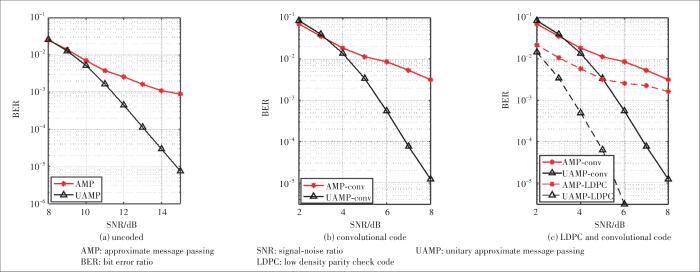 ... We then evaluate the performance of the detectors in a coded OTFS system, where the turbo receiver in Fig. 4 is employed. The number of paths P=14, and a rectangular waveform is used. In Fig. 7(a), we show the performance of the uncoded system with the AMP and UAMP detectors. In Fig. 7(b), we use a rate-1/2 convolutional code with a generator followed by a random interleaver and QPSK modulation. The length of the codeword is . The BCJR algorithm is used for the SISO decoder. We can find that the performance gaps between the AMP detector and the UAMP detector become larger in the coded system. The turbo receiver can achieve much better performance (about dB at the BER of ) thanks to the joint processing of decoding and detection. In Fig. 7(c), we investigate the performance of the system with a more powerful LDPC. The 8 192 information bits are coded at rate R=1/2 by an irregular LDPC code with an average column weight of 3, then the coded bits are randomly interleaved and mapped. As expected, the system performance is improved considerably when the LDPC is used. From Fig. 7(c), we can see that the use of the LDPC code can improve the performance of the UAMP based detector significantly and the performance gap between AMP and UAMP increases when the LDPC is used.
